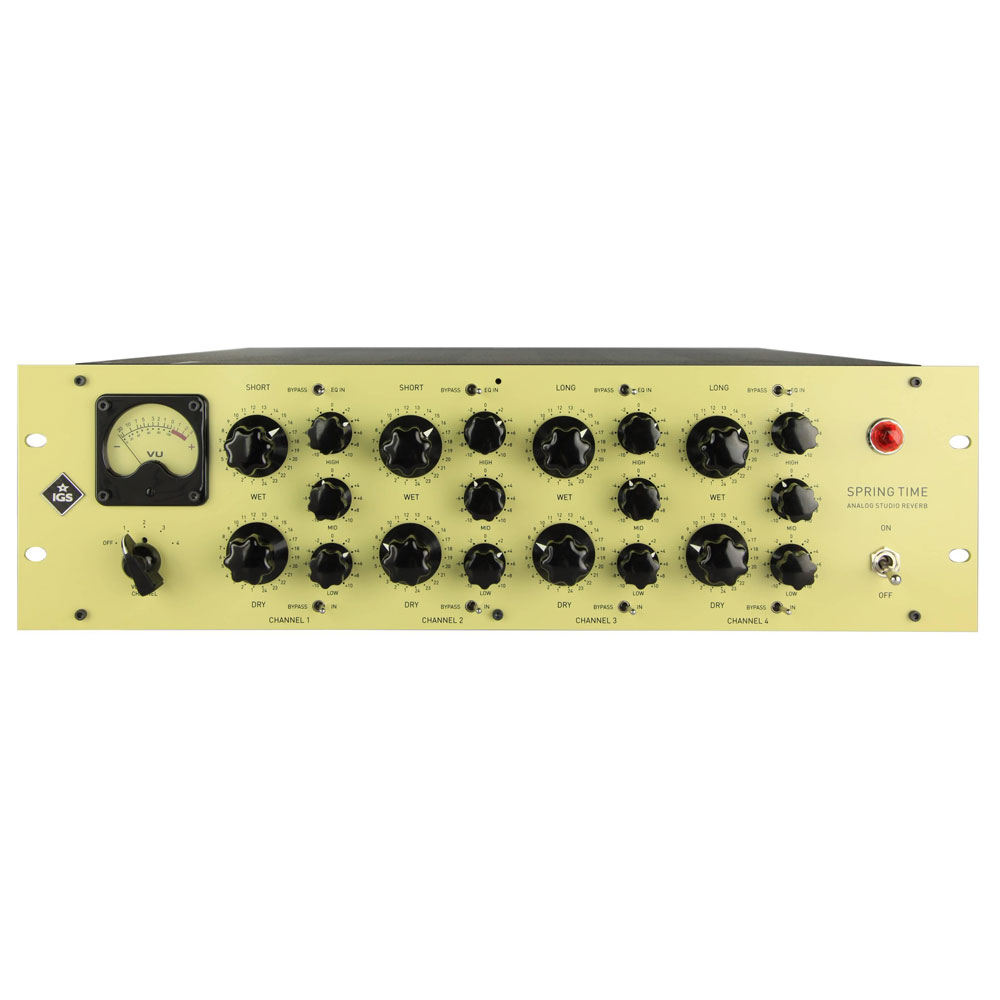 El IGS Springtime es un reverb analógico de estudio de 4 canales basada en tanques de resortes duales por canal. Cada canal incorpora dos pares de resortes: uno corto y uno largo, permitiendo trabajar diferentes tiempos y densidades de decaimiento dentro de la misma unidad. Esta arquitectura ofrece flexibilidad tanto en aplicaciones mono como estéreo, y posibilita combinaciones en paralelo entre ambos tipos de resortes.